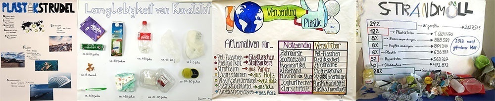 8-12 Tonnen Plastikteile erreichen jedes Jahr die Ozeane und bilden gigantische Müllinseln. Die Schülerinnen und Schüler der 4b und 4d-Klasse haben sich mit dieser Problematik auseinandergesetzt und Poster, Kunstobjekte und Videobeiträge gestaltet.