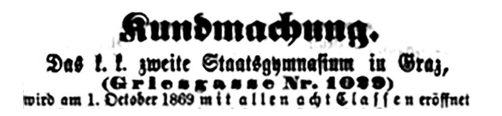 Genau am 1. Oktober vor 150 Jahren hat der damalige Direktor Anton Maresch das k.k. zweite Staatsgymnasium in Graz in der Griesgasse 1029 mit 8 Klassen eröffnet. Der Umzug in unser heutiges Schulgebäude erfolgte erst 20 Jahre später, im Jahre 1889.
